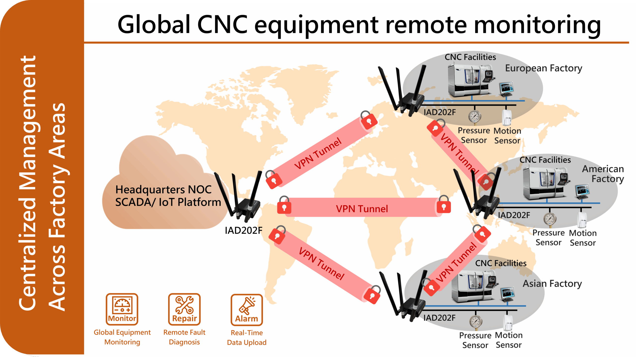 Large manufacturers typically have multiple factories, even distributed across countries. Through the IAD202F's wireless networking capabilities, equipment from various locations can be unified into a central management system. Advantages include eliminating the need for local fixed network infrastructure, rapid deployment of overseas facilities, real-time monitoring of global production capacity, unified cybersecurity policies and VPN architecture. VPN tunnels can securely transmit data from each factory back to headquarters, achieving true global smart manufacturing.