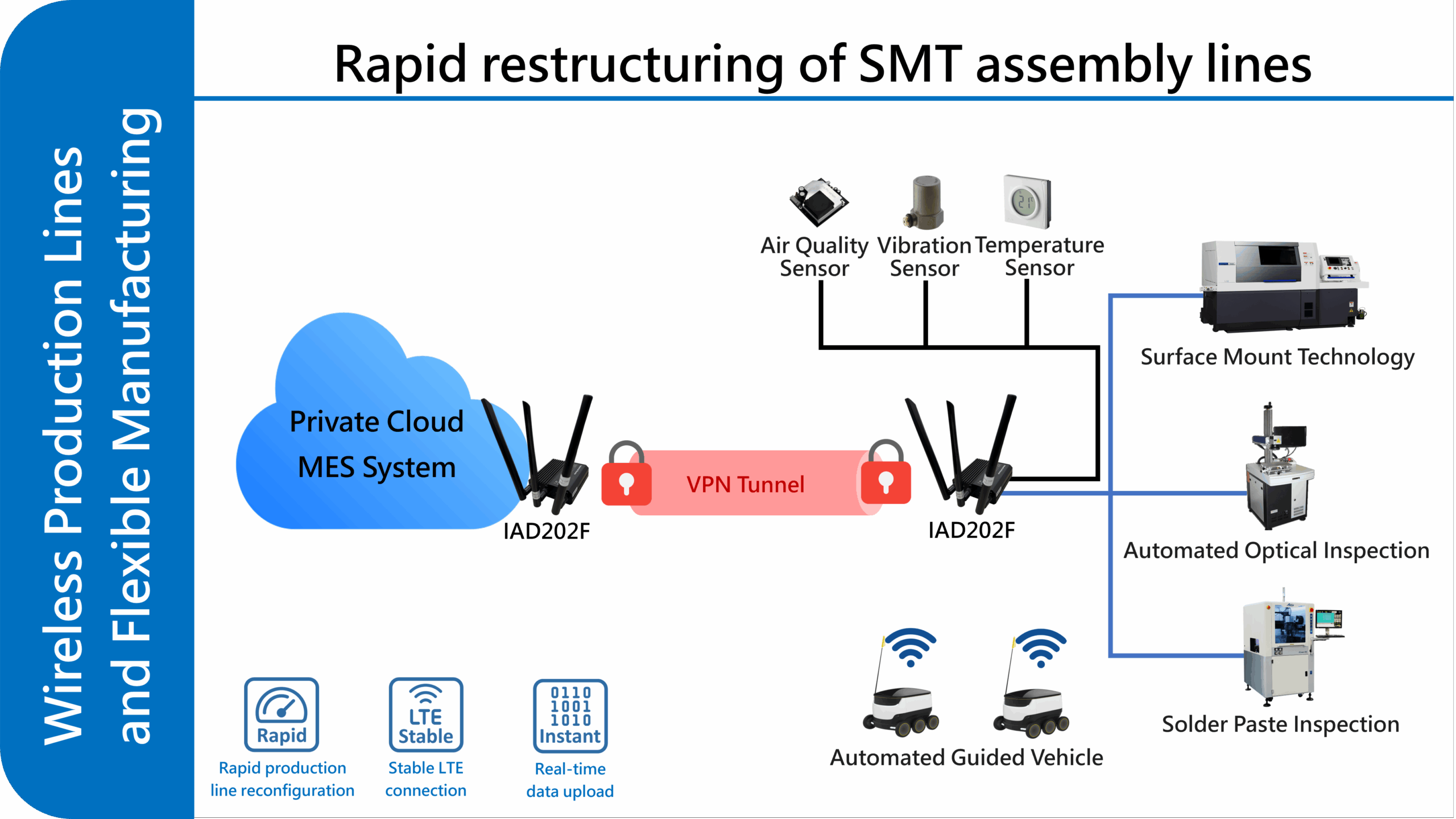 When introducing new products, the production lines are rearranged, with each line equipped with one IAD202F. SMT machines, Automated Optical Inspection (AOI), and Solder Paste Inspection (SPI) equipment are connected. AGVs and mobile workstations are directly connected via 4G, and then via VPN to the Manufacturing Execution System (MES) deployed on the enterprise's private cloud. The MES obtains real-time equipment status and production data, while the AGVs, transporting materials between production lines, simultaneously transmit their location and task status.
