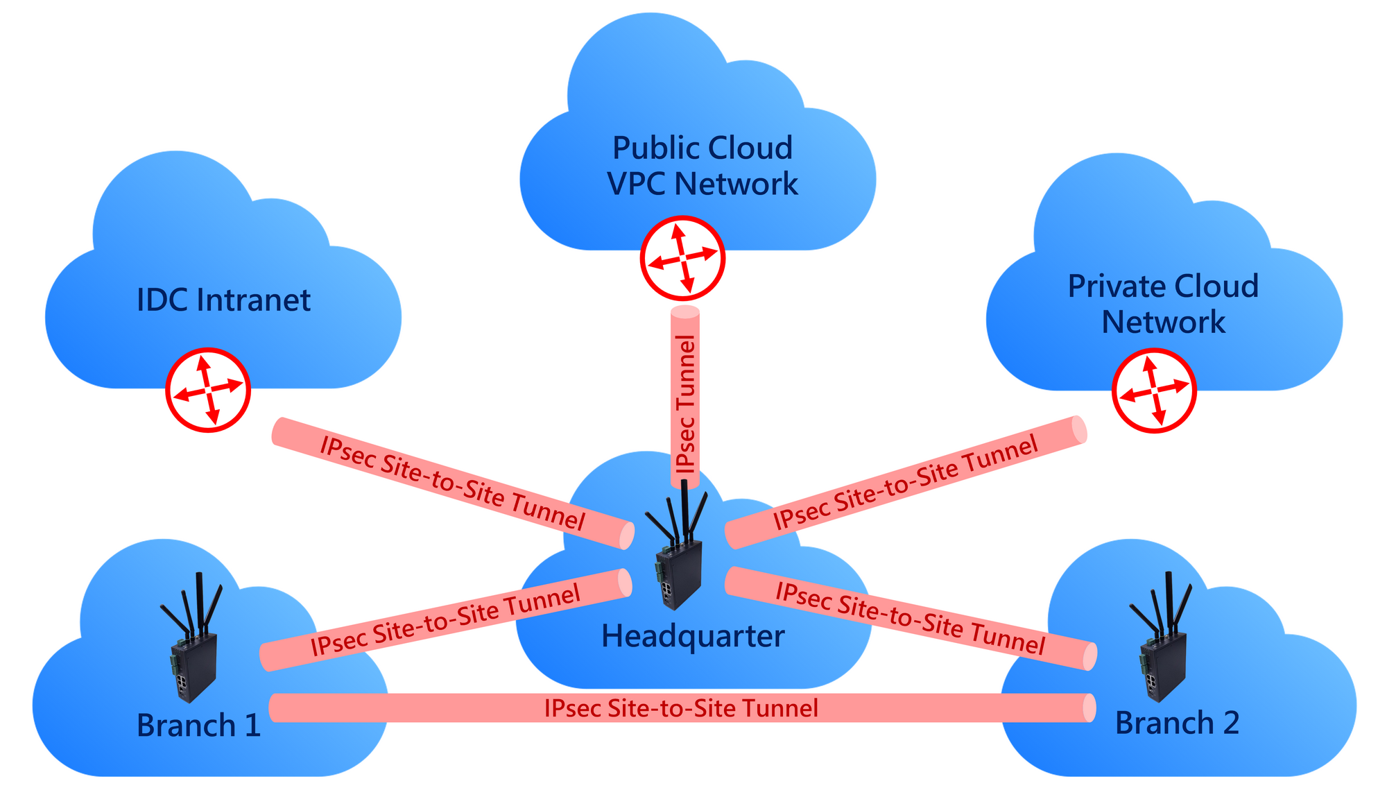 ● Establish VPN tunnels between headquarters and branch offices, securely interconnecting regional LANs.
