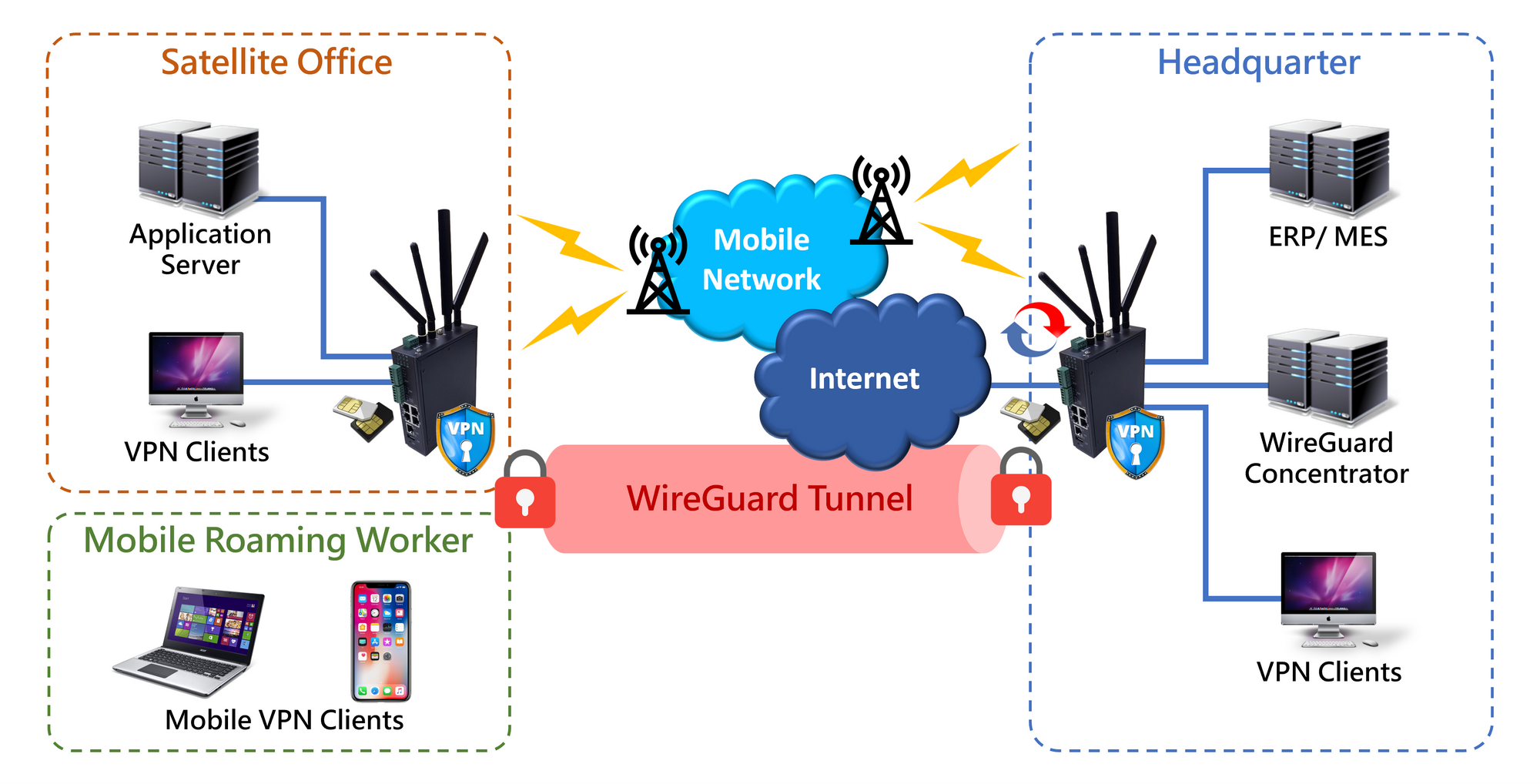 ● Employees in each location can access file servers, ERP systems, and internal resources as if on the same intranet.
