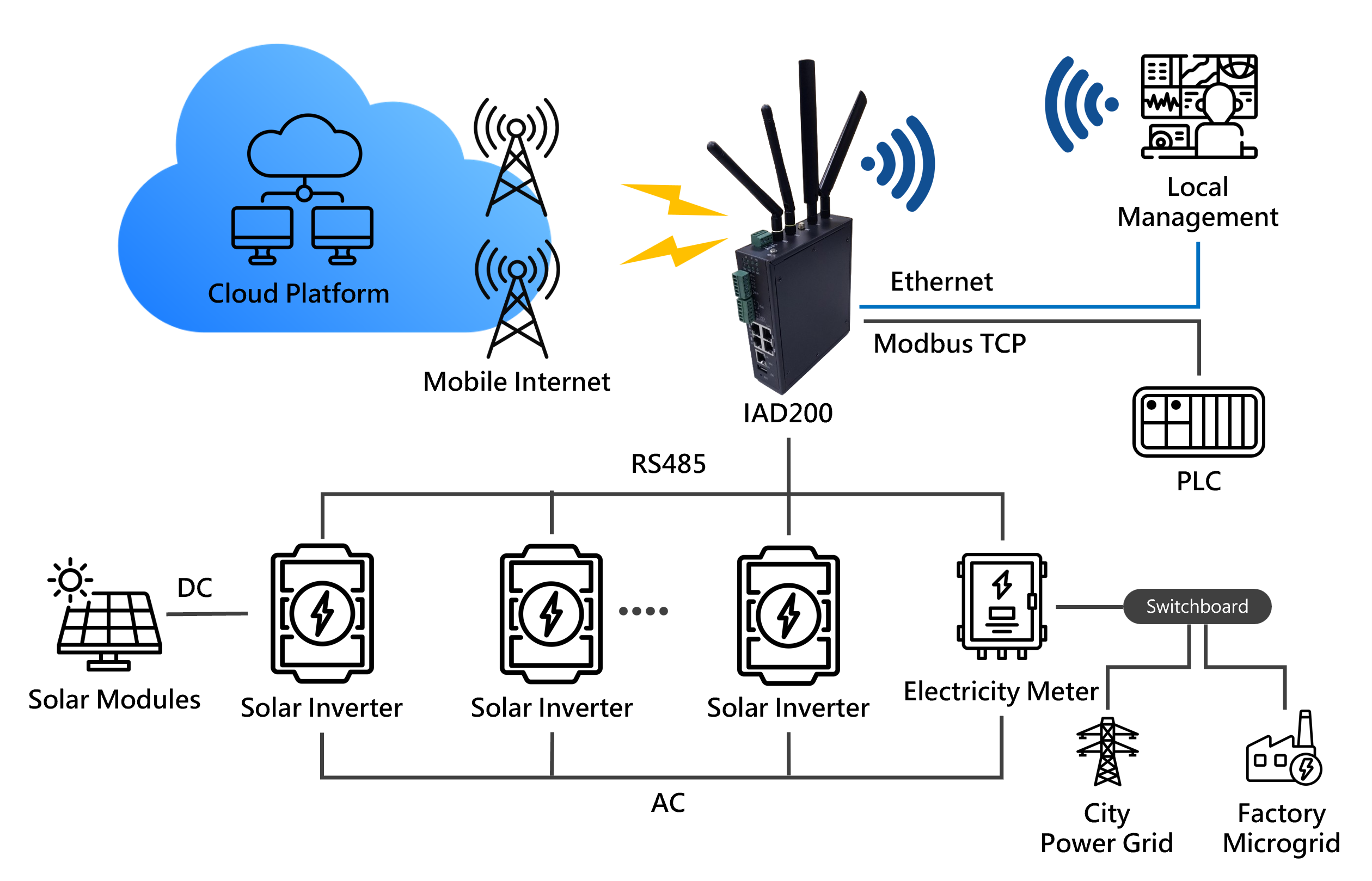 In smart grid architectures, solar power generation must provide real-time feedback on power generation, equipment status, temperature, and voltage, enabling cloud-based monitoring and predictive maintenance. Because power plants are often located in remote areas, traditional wired network cabling is costly and difficult to maintain. Therefore, communication solutions based on mobile wireless networks are becoming increasingly popular.